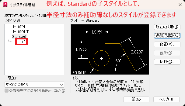 半径寸法補助線について